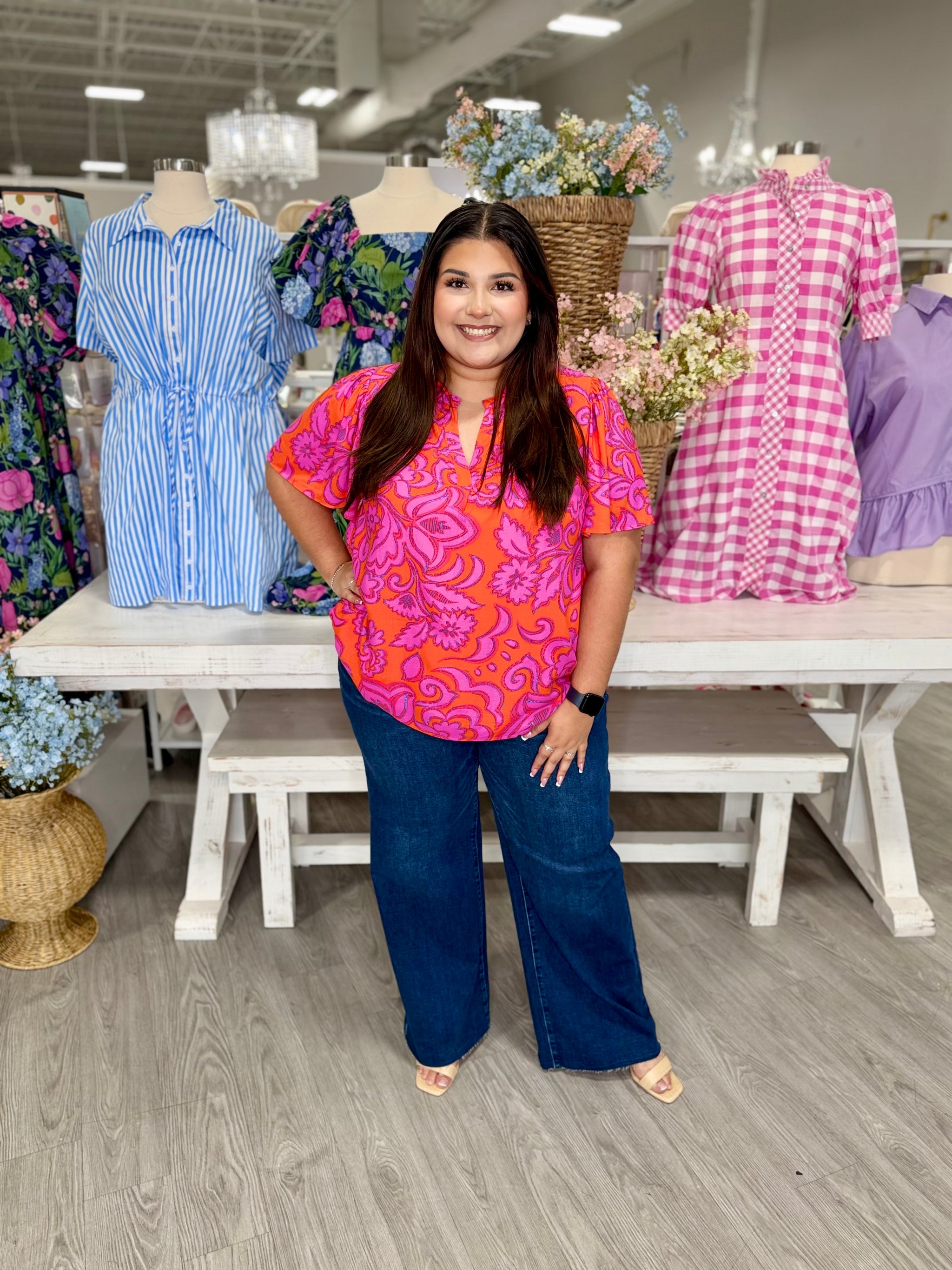 Brighten your day in this playful flutter-sleeve top, featuring a delicate split neck and a cheerful pink-and-orange floral print. Light,...