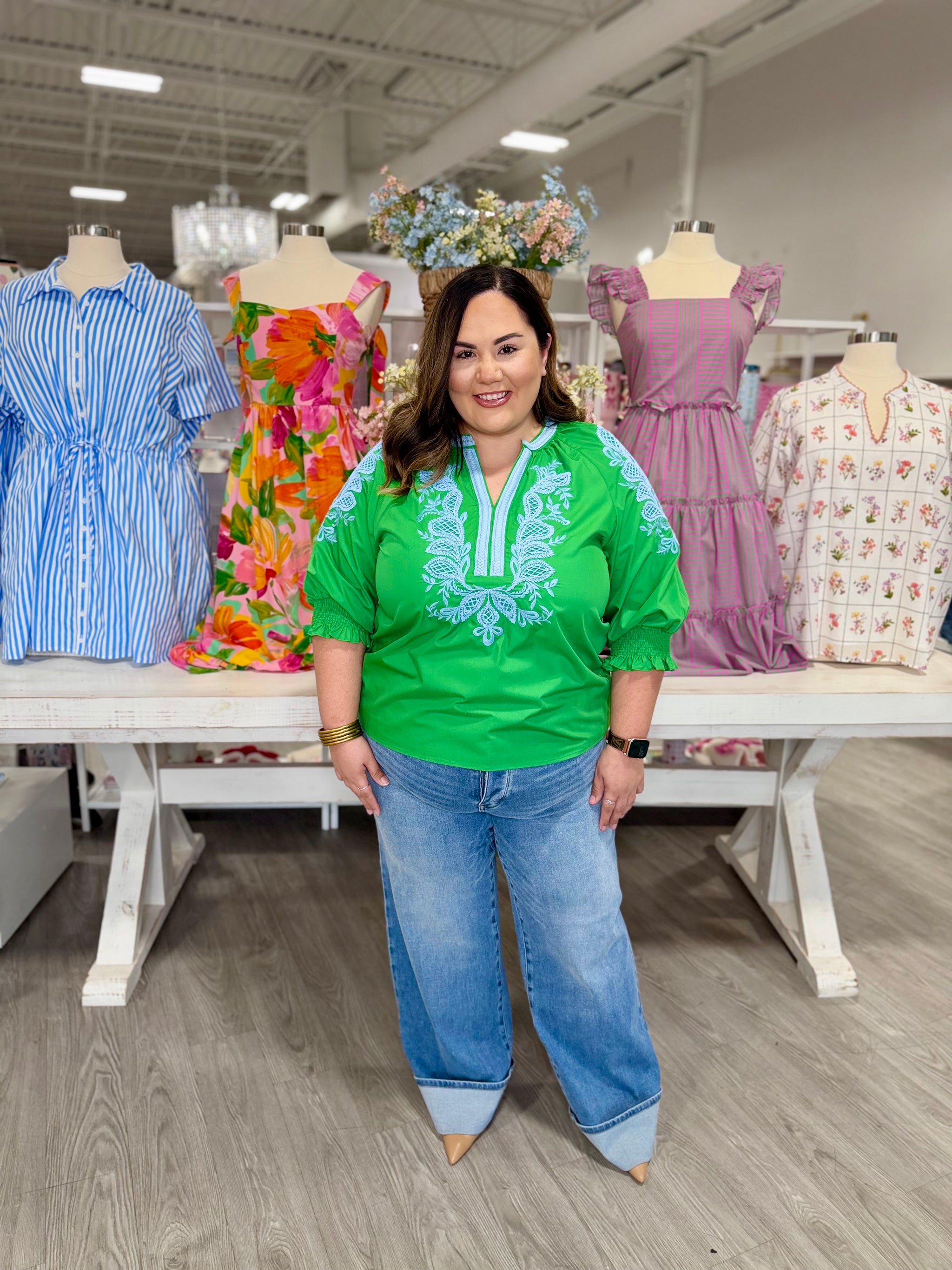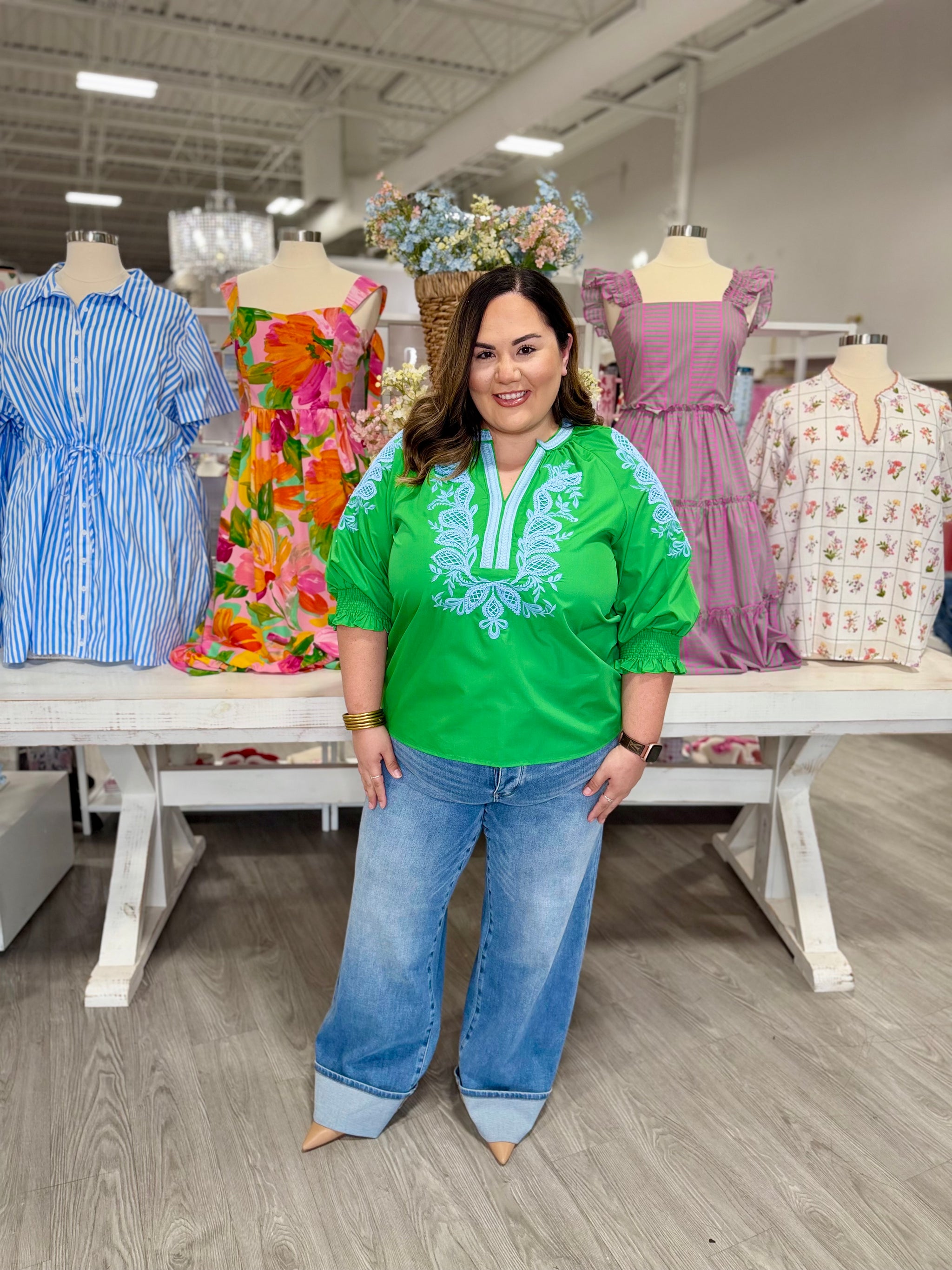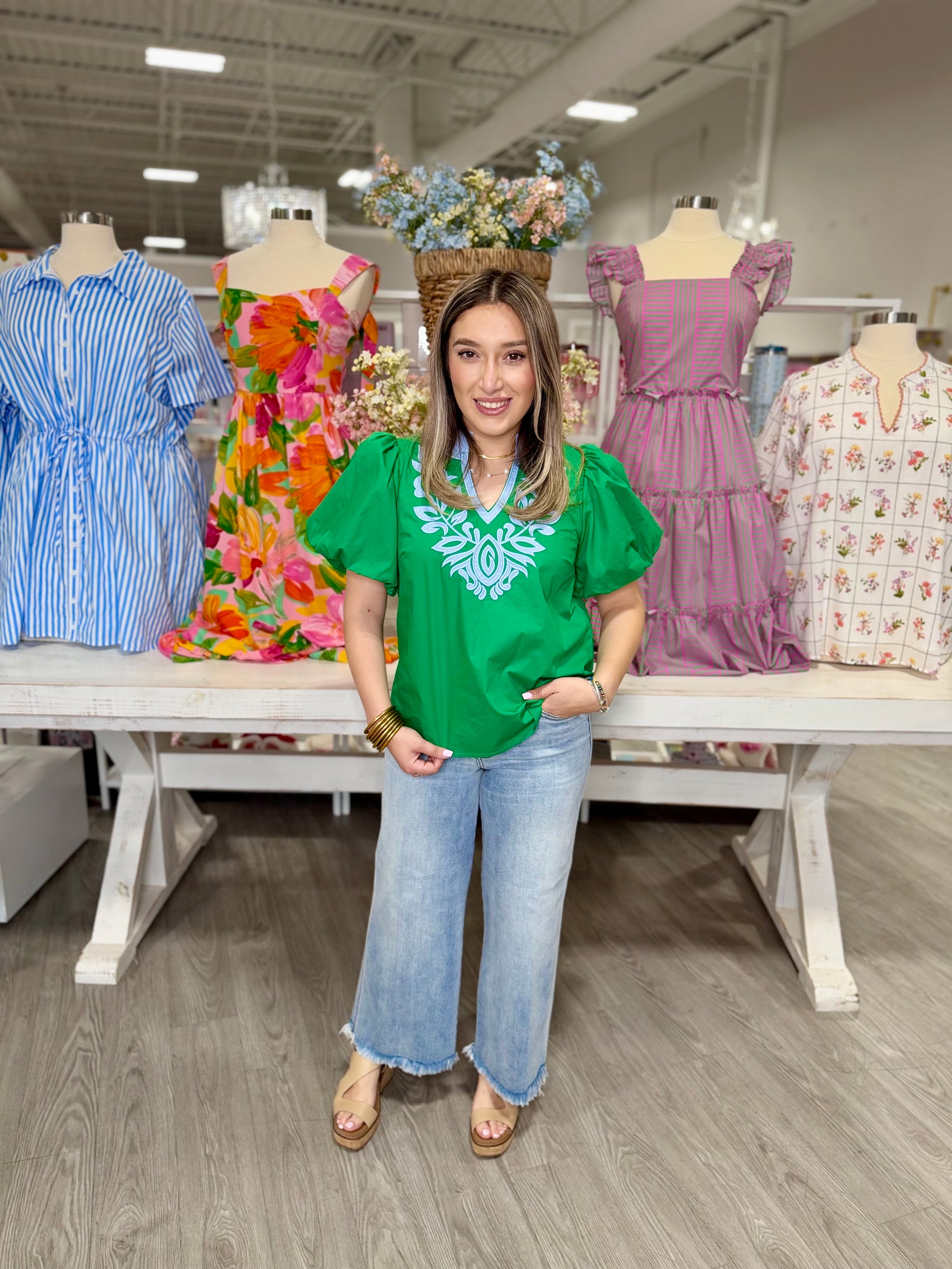 Elevate your spring wardrobe with the MAGGIE TOP, a sophisticated 3/4 sleeve design in vibrant blue and green hues. The...