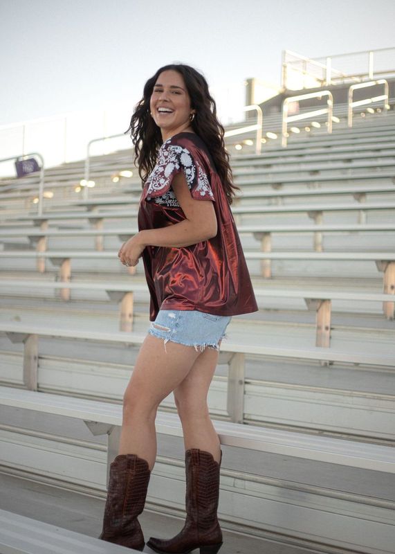 – Sold OutA metallic top is the perfect way to jazz up an outfit! The Wylie Top is a Maroon metallic butterfly...