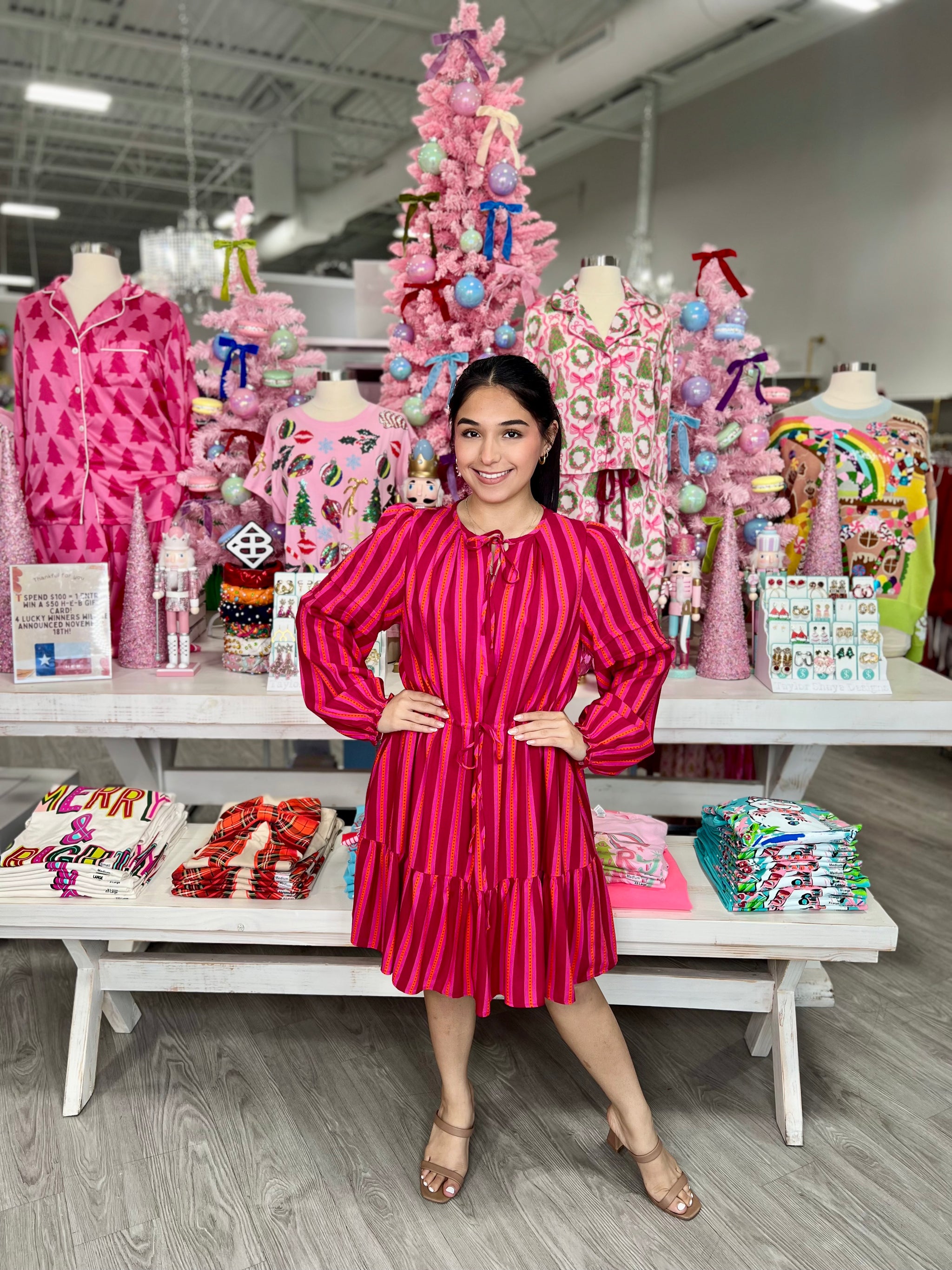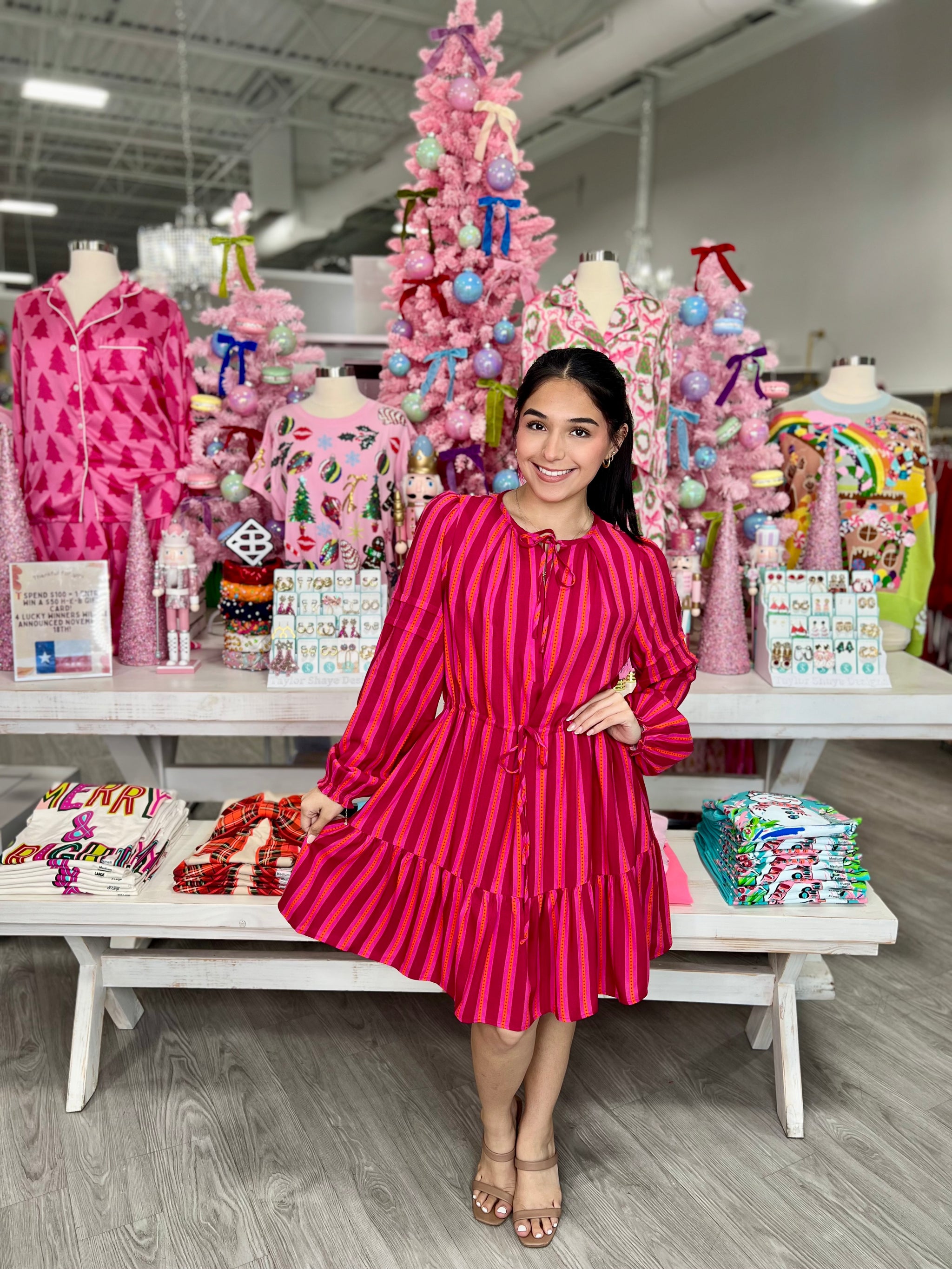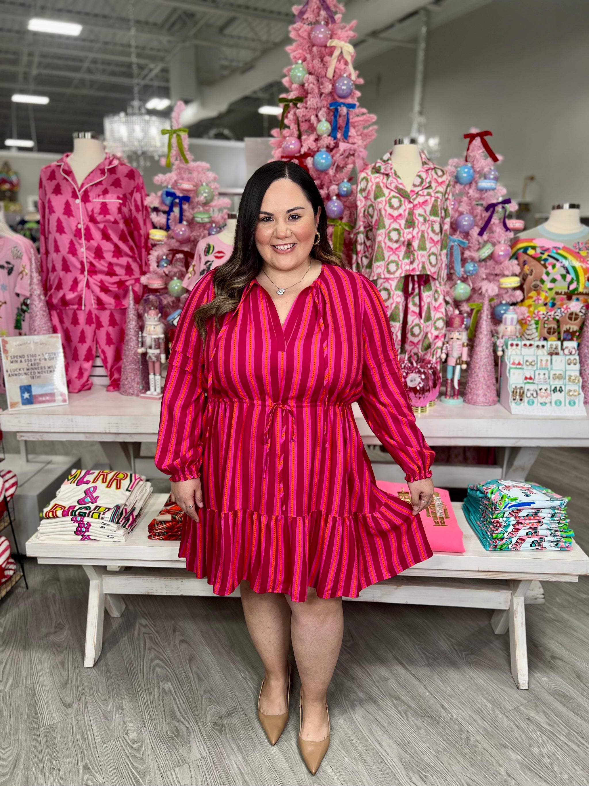Embrace effortless style with the XOCHITL Stripes Dress, your go-to piece for any moment. This vibrant fuchsia orange mini dress...