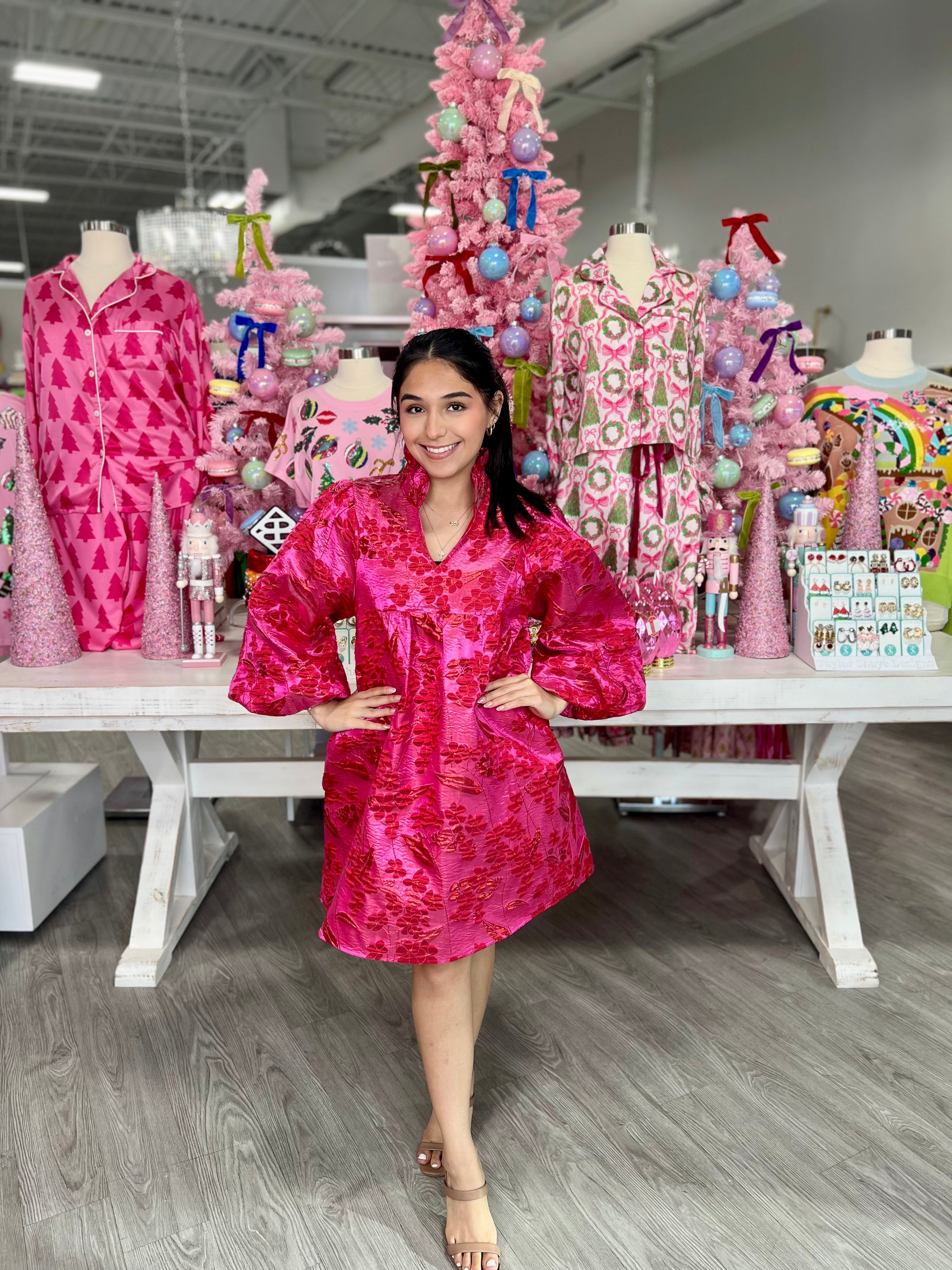 The ABBY DRESS is your go-to holiday showstopper. This stunning piece features eye-catching hot pink and red floral jacquard that...