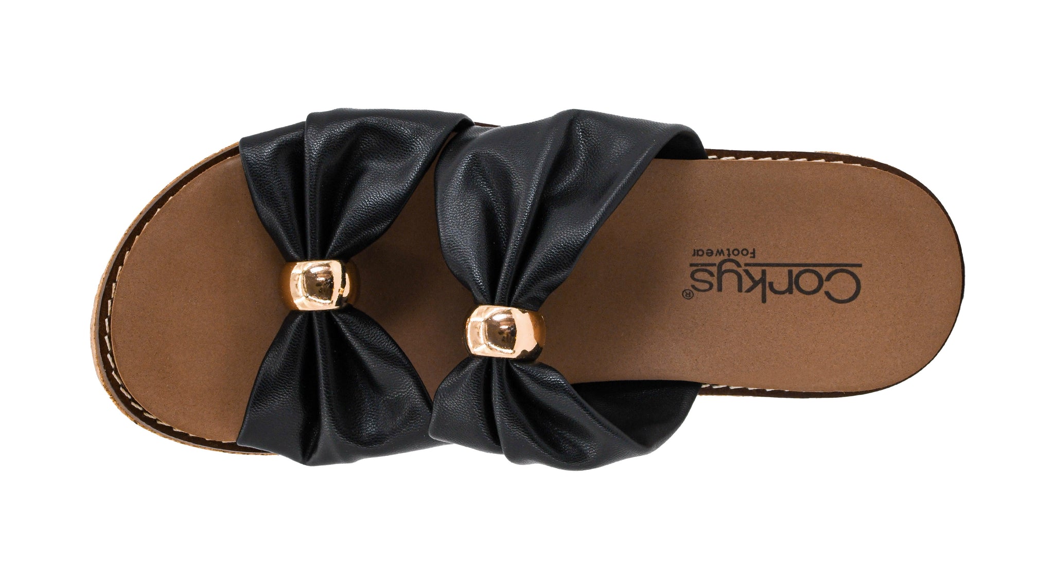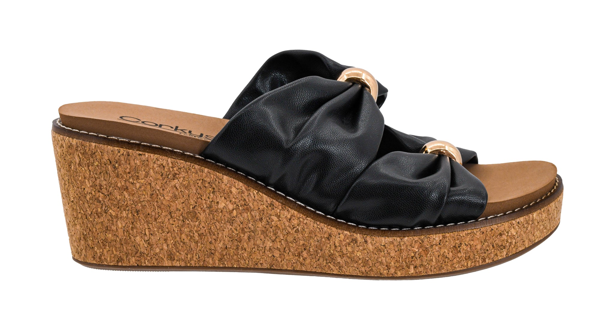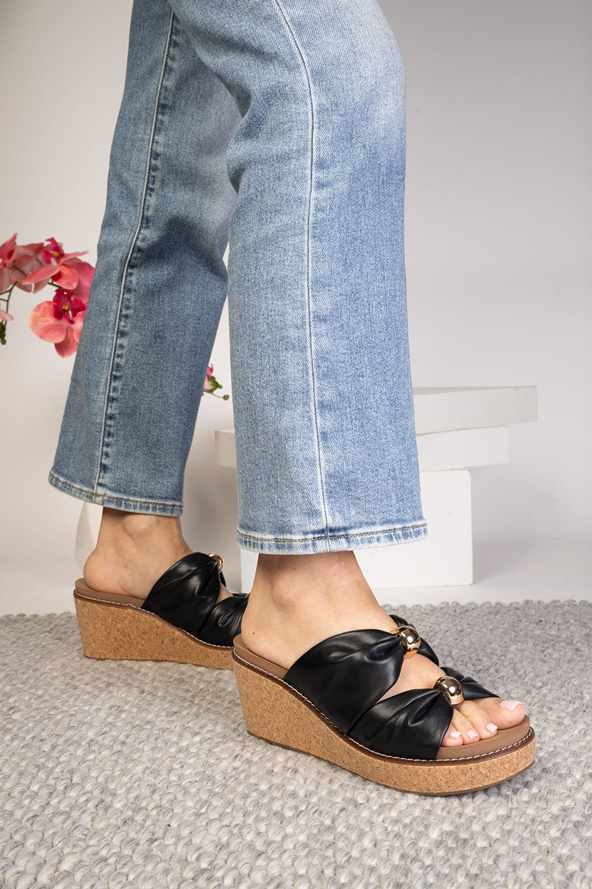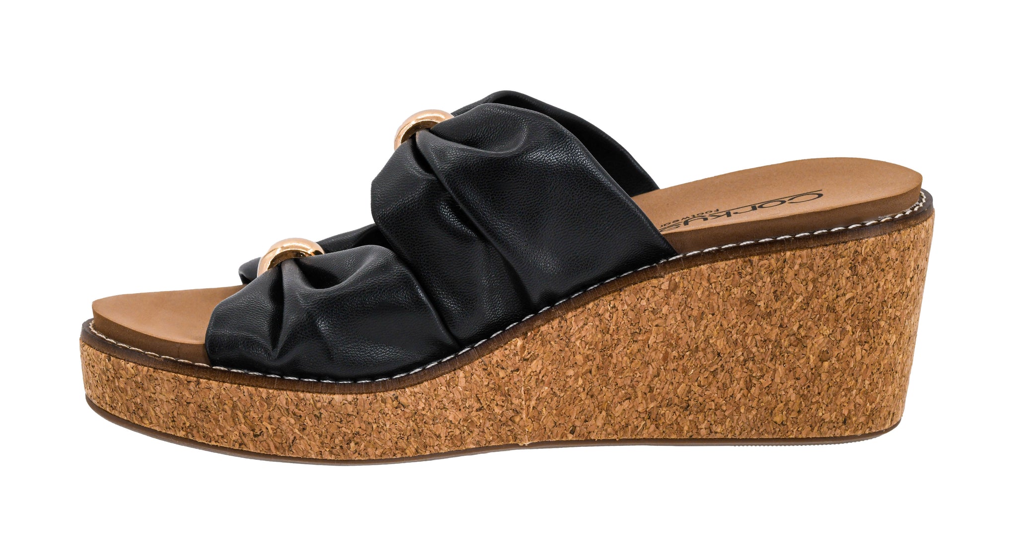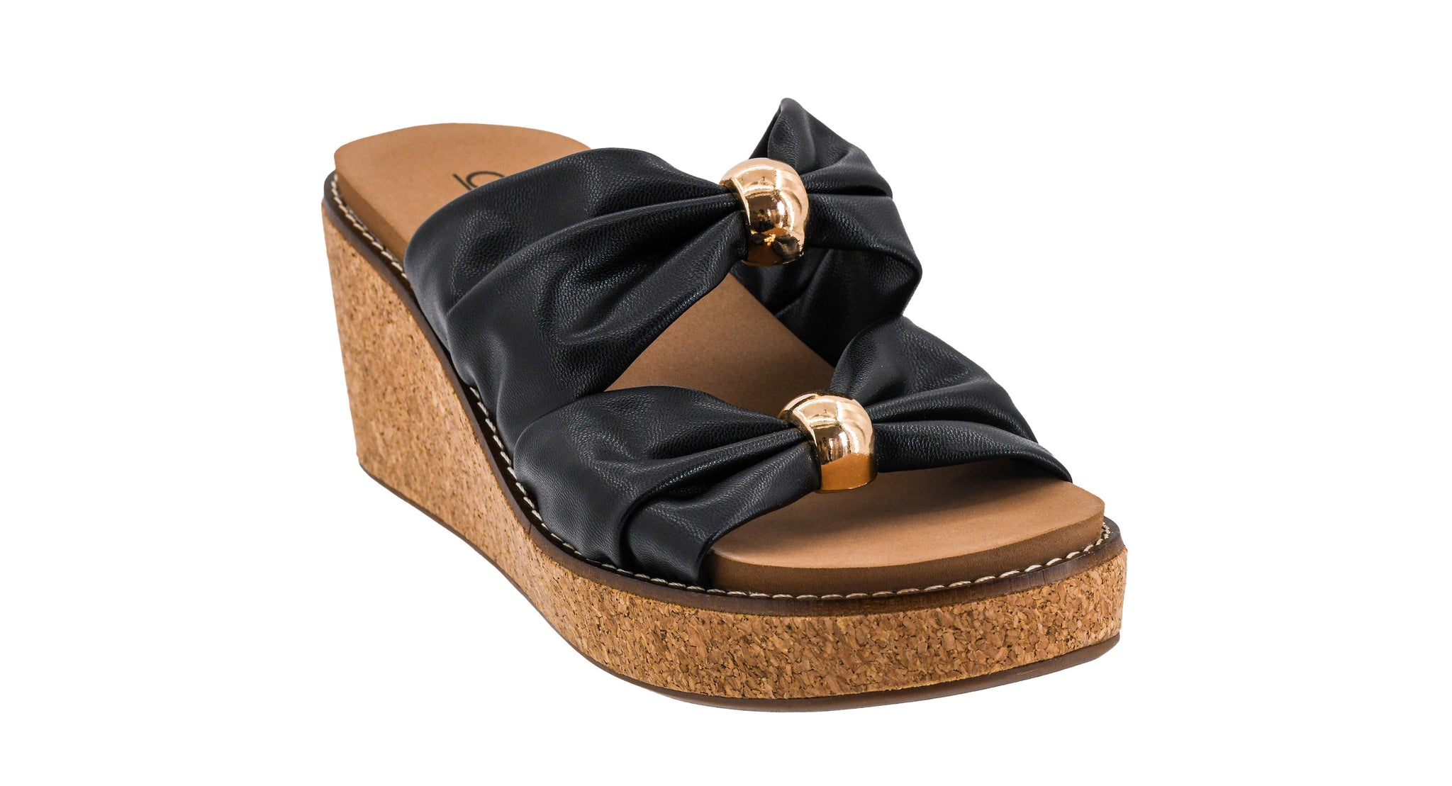 Faux Leather Upper Embellished with Gold Details Double Bow Design Slip On For Easy Entry Cushioned Footbed 3 Inch Cork...