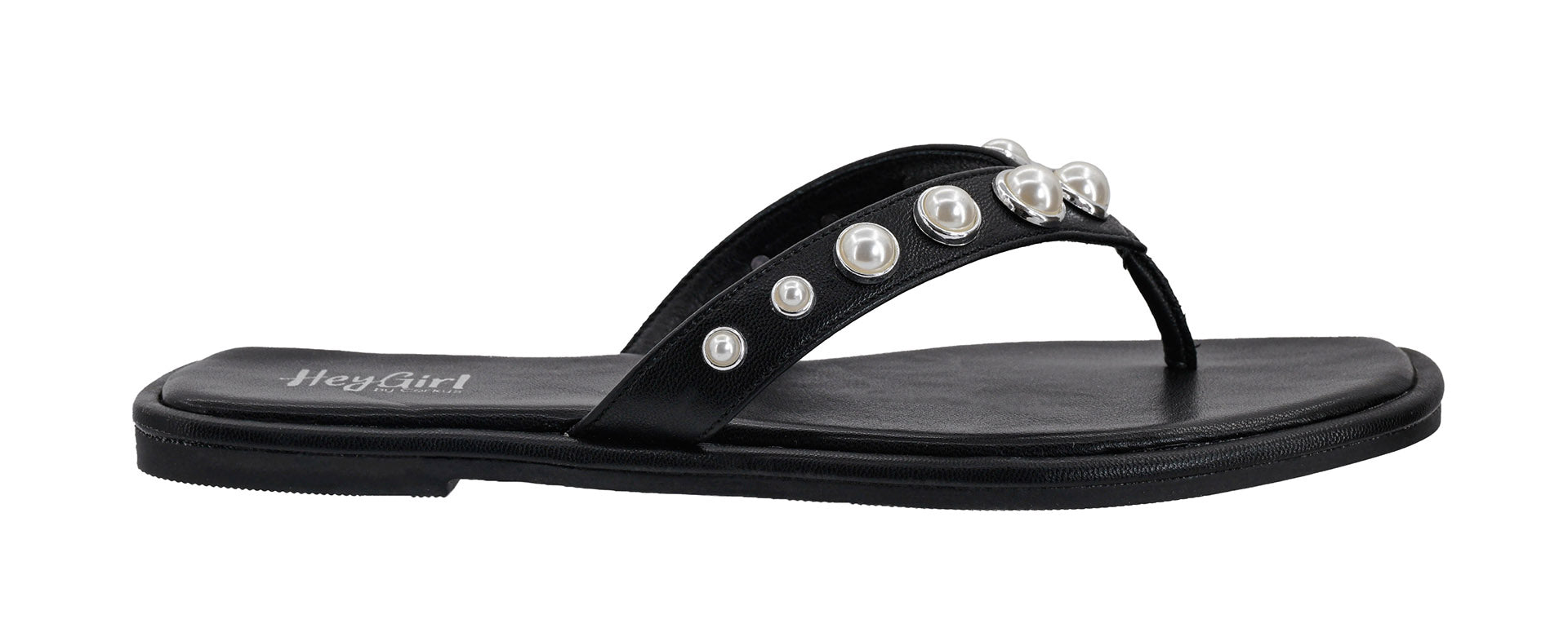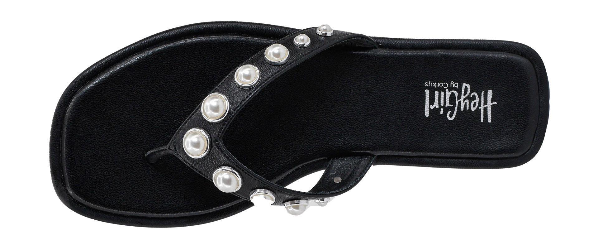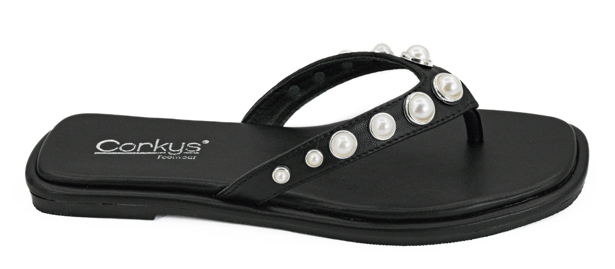 Elevate your vacation style with the Corkys What's the Gossip Black sandal, featuring chic clear straps and elegant pearl embellishments....