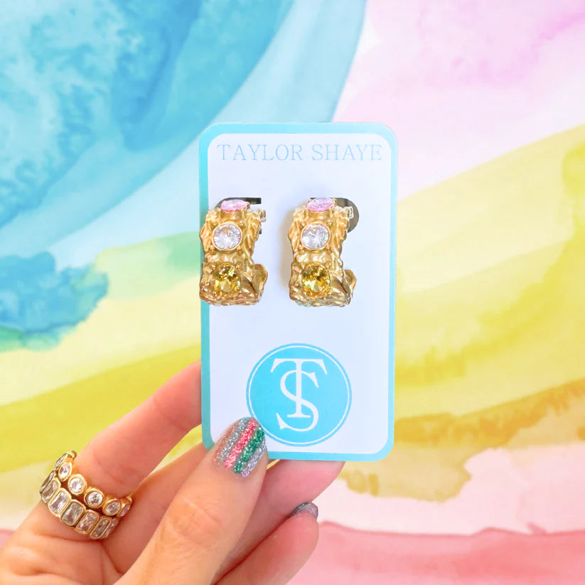 Make a statement with these eye-catching Elizabeth Hoops, featuring vibrant pink, yellow, and clear stones set into chunky gold-plated hoops....