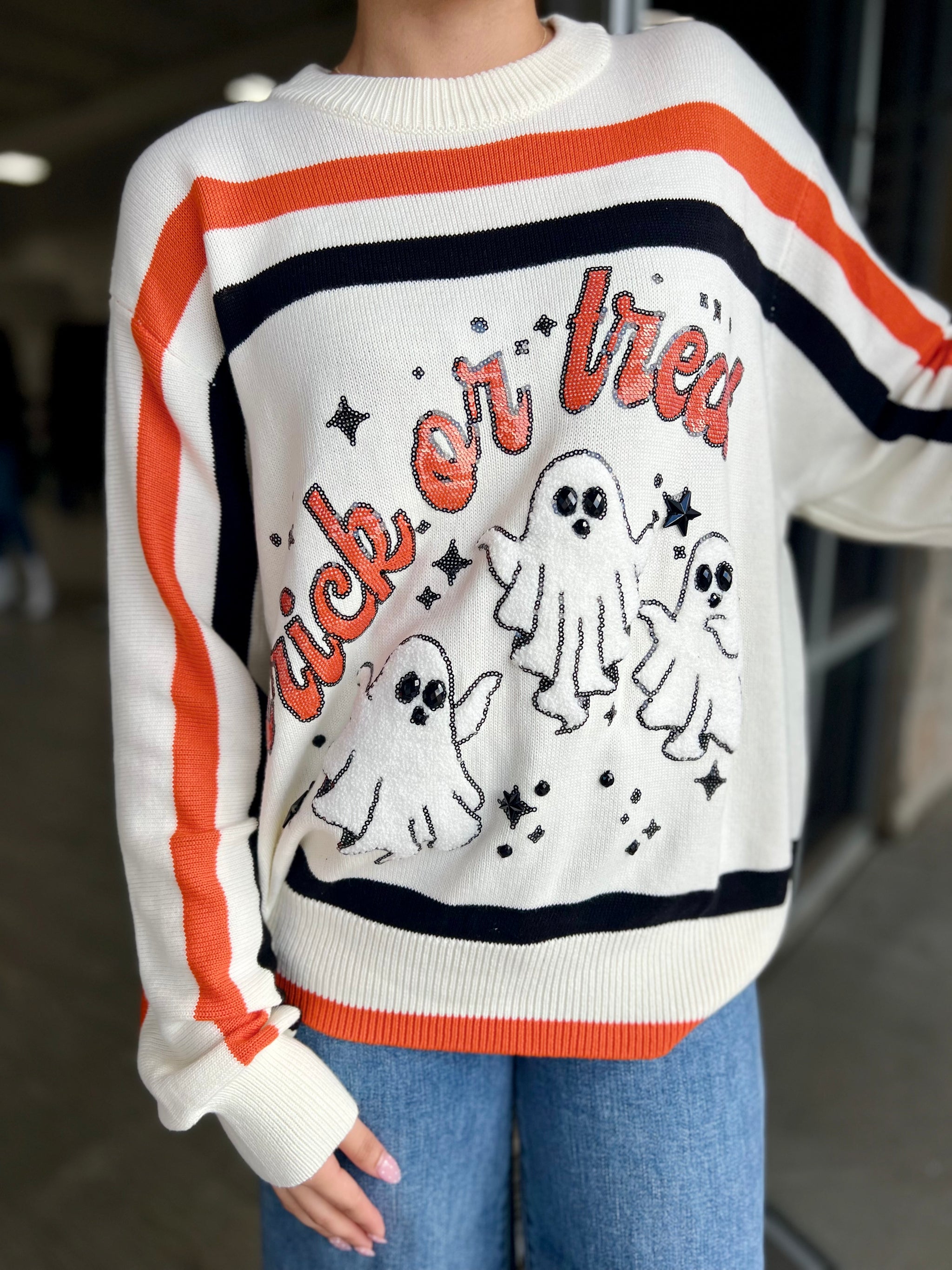 – Sold OutCelebrate Halloween in style with the Queen of Sparkles Trick or Treat Sweater. This cozy oversized crew neck knit features...