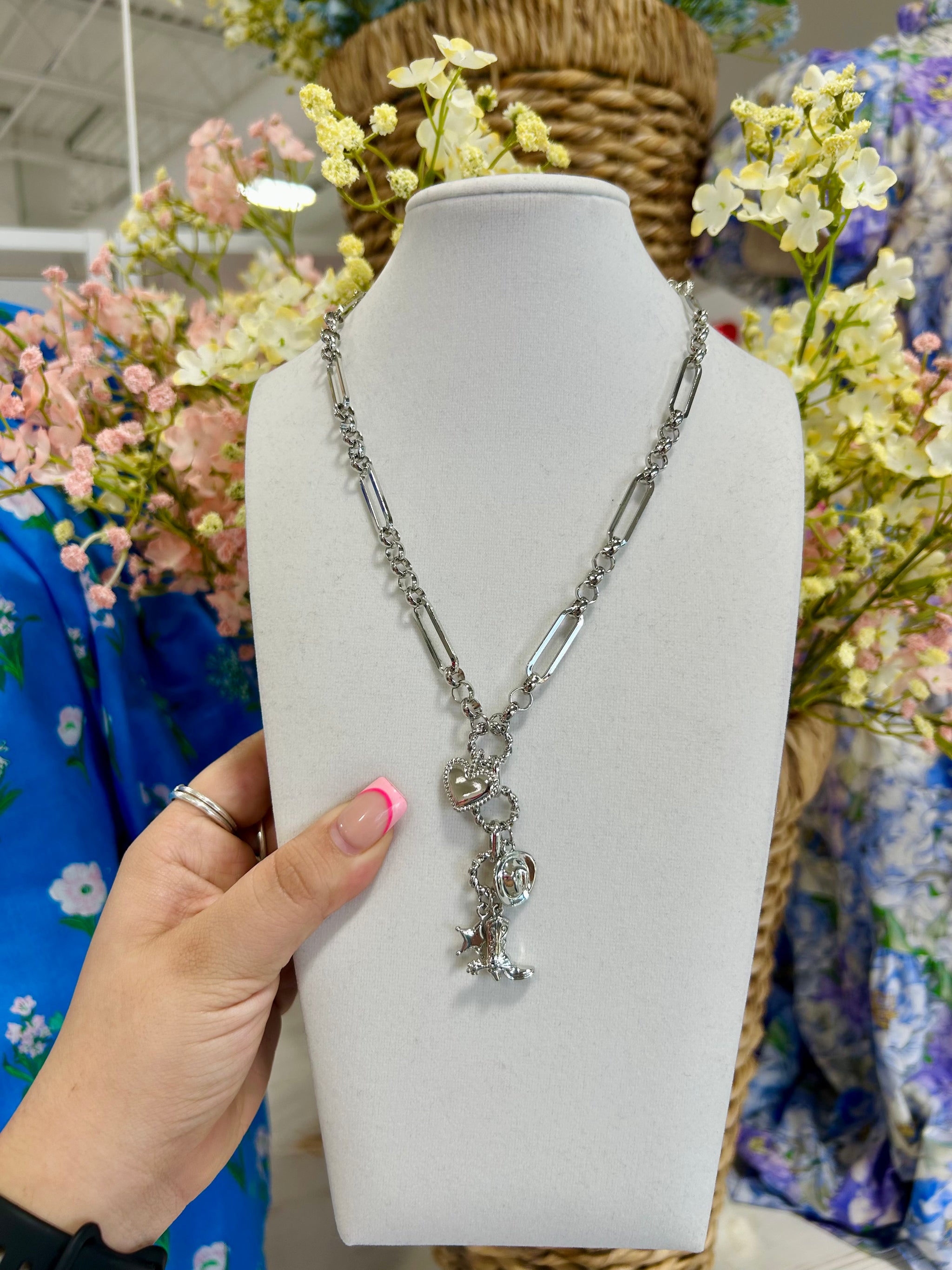 – Sold Out*Saddle up in style with this stunning cowgirl charm necklace, where Western flair meets timeless elegance. Crafted in gleaming silver,...