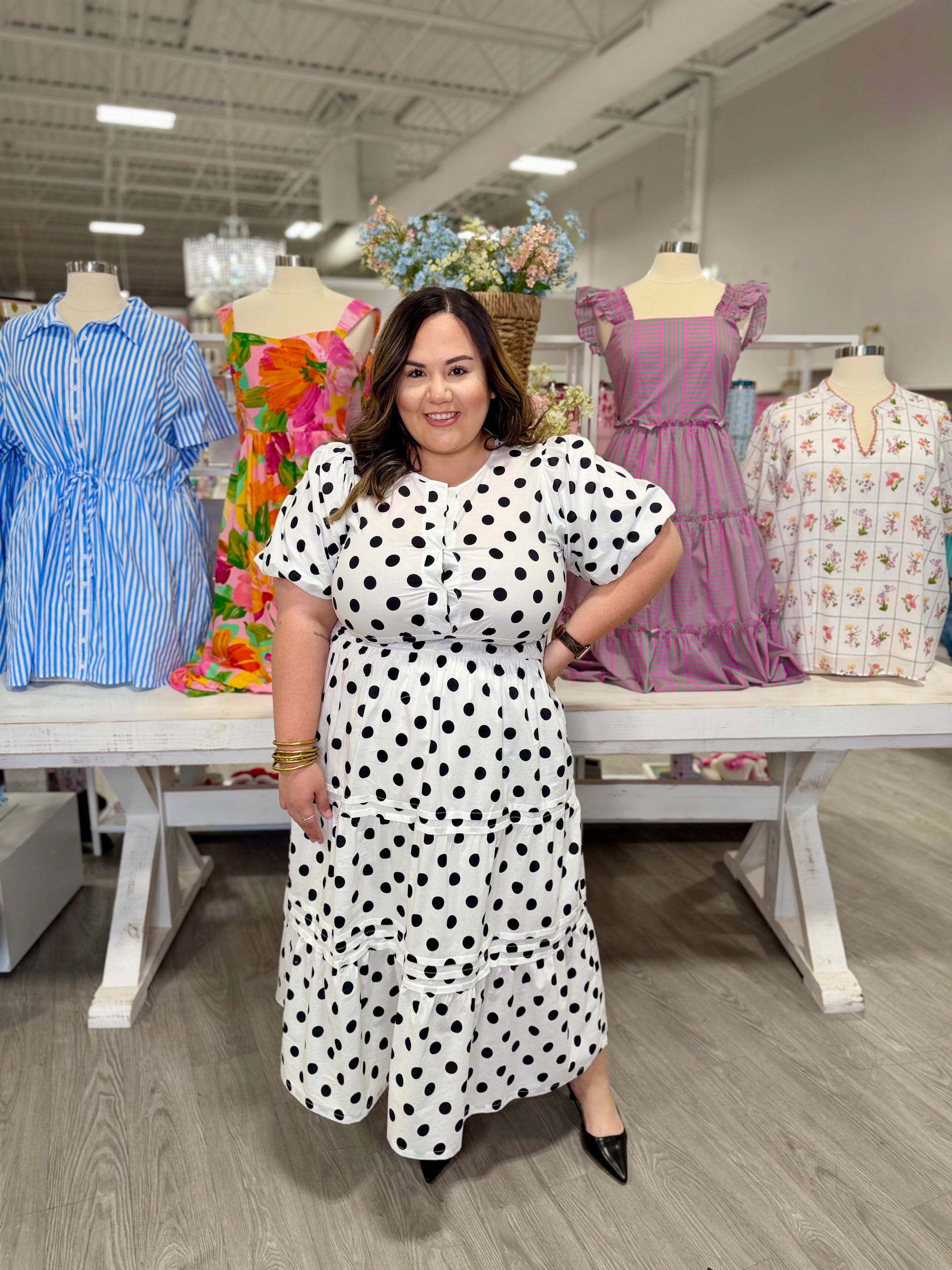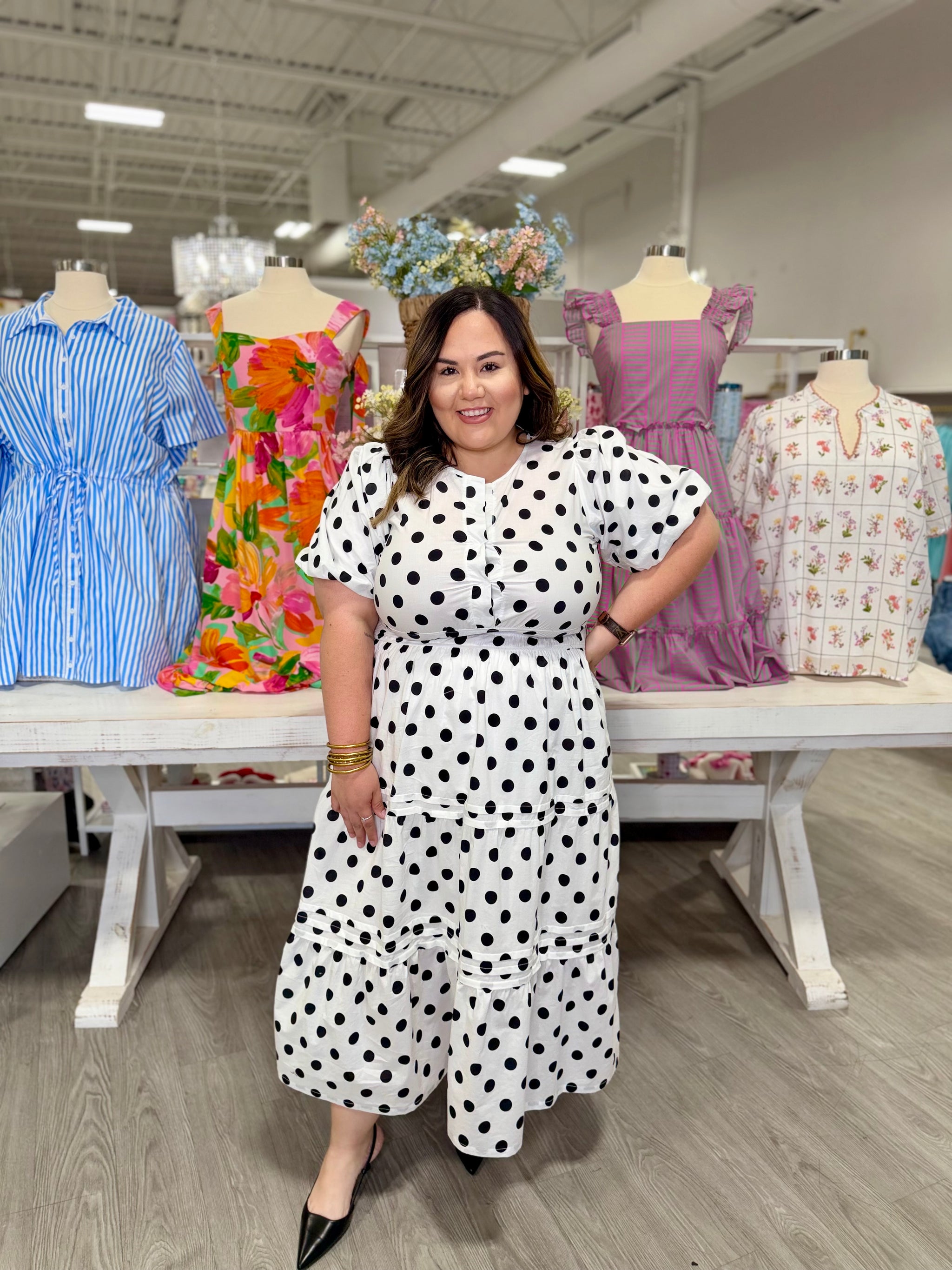 Elevate your wardrobe with the Reese Polka Dot Dress, a charming midi silhouette featuring playful polka dot print. The puffed...