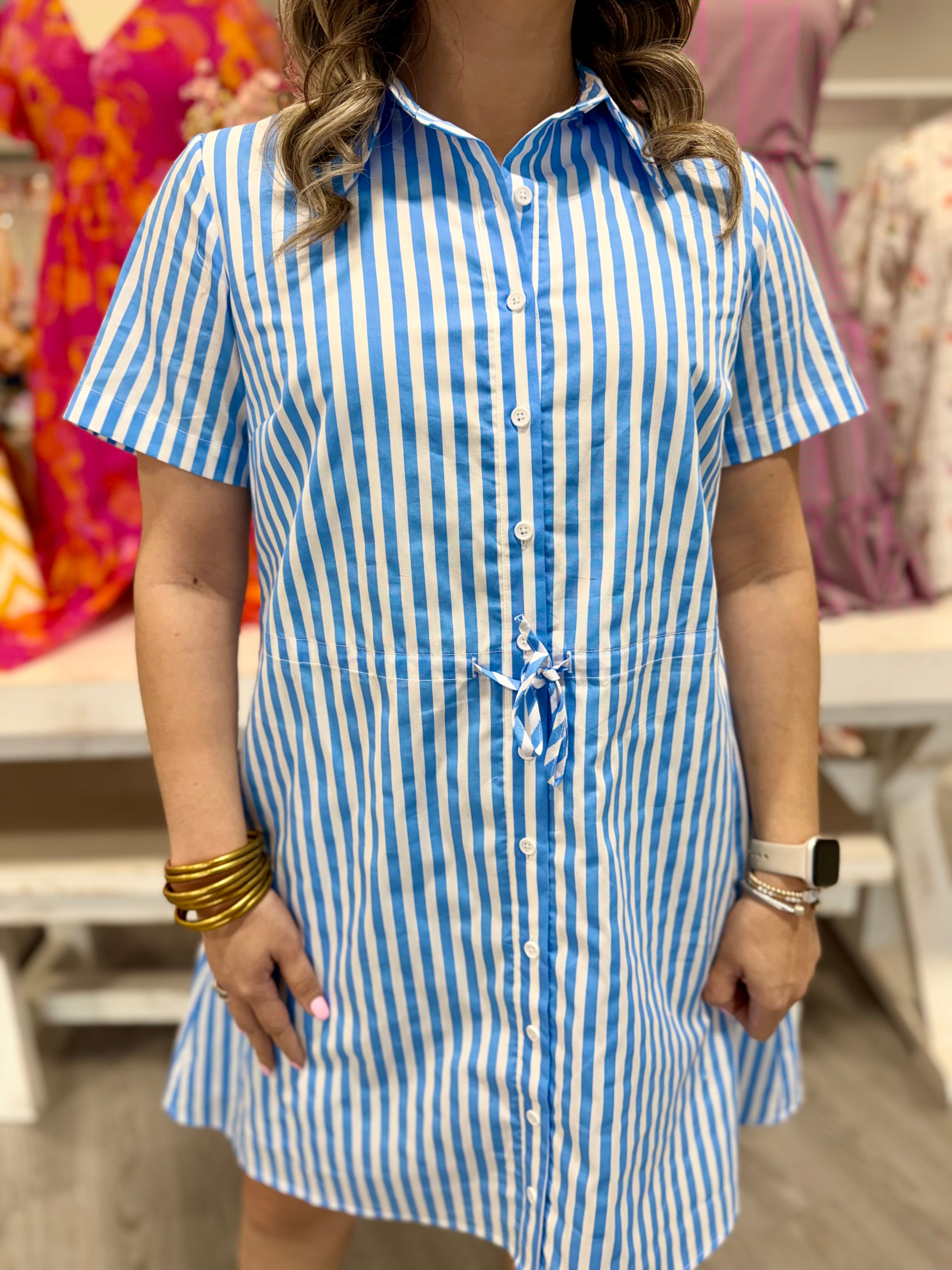 Elevate your wardrobe with this striped dress that balances timeless design with casual ease. Designed to flatter every figure, it features a drawstring waist with a collared neck. The short sleeves pair well with the button down feature. Wear it with heels and silver jewelry for a complete look.