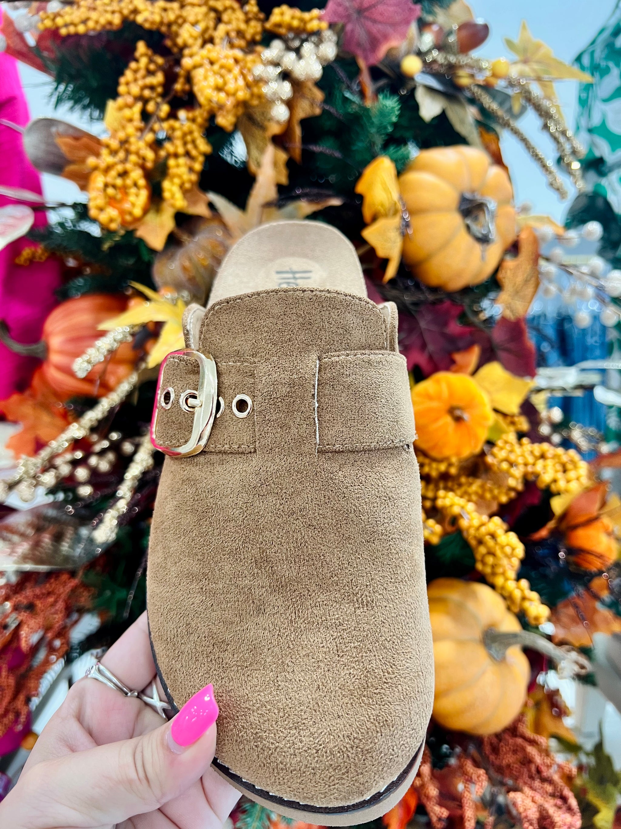 Slip into ultimate comfort with these suede buckle clogs—your new everyday essential. Designed with a cushioned cork footbed and slip-on...