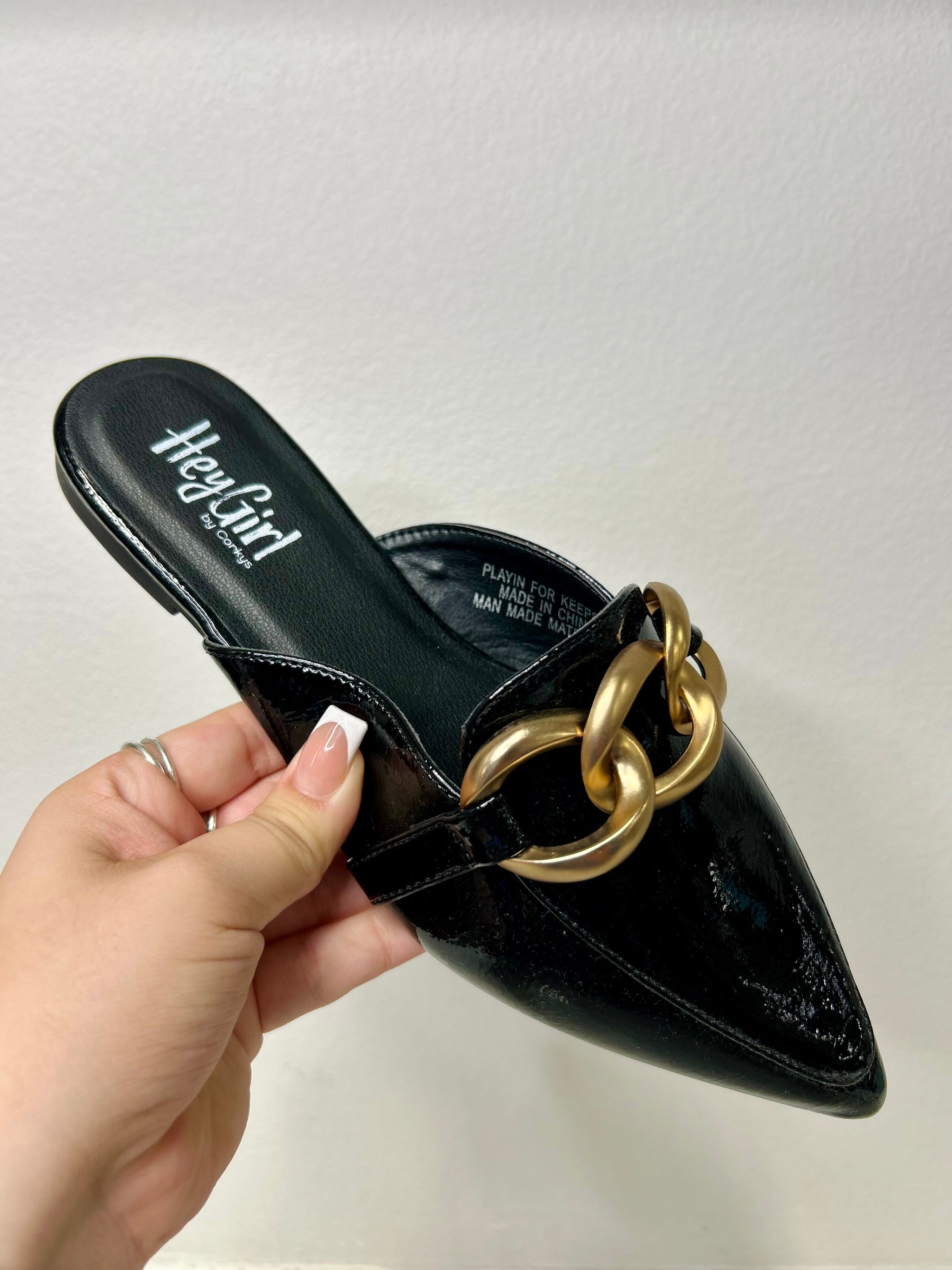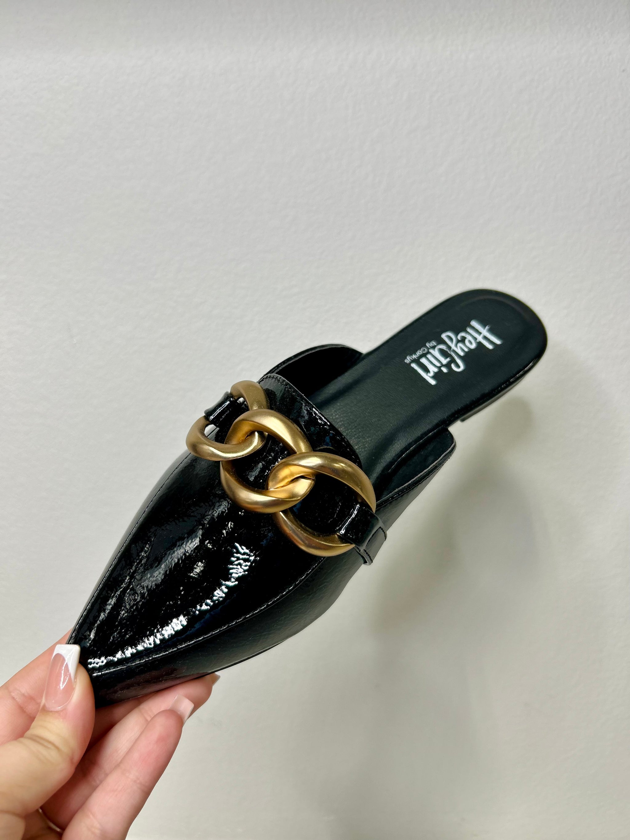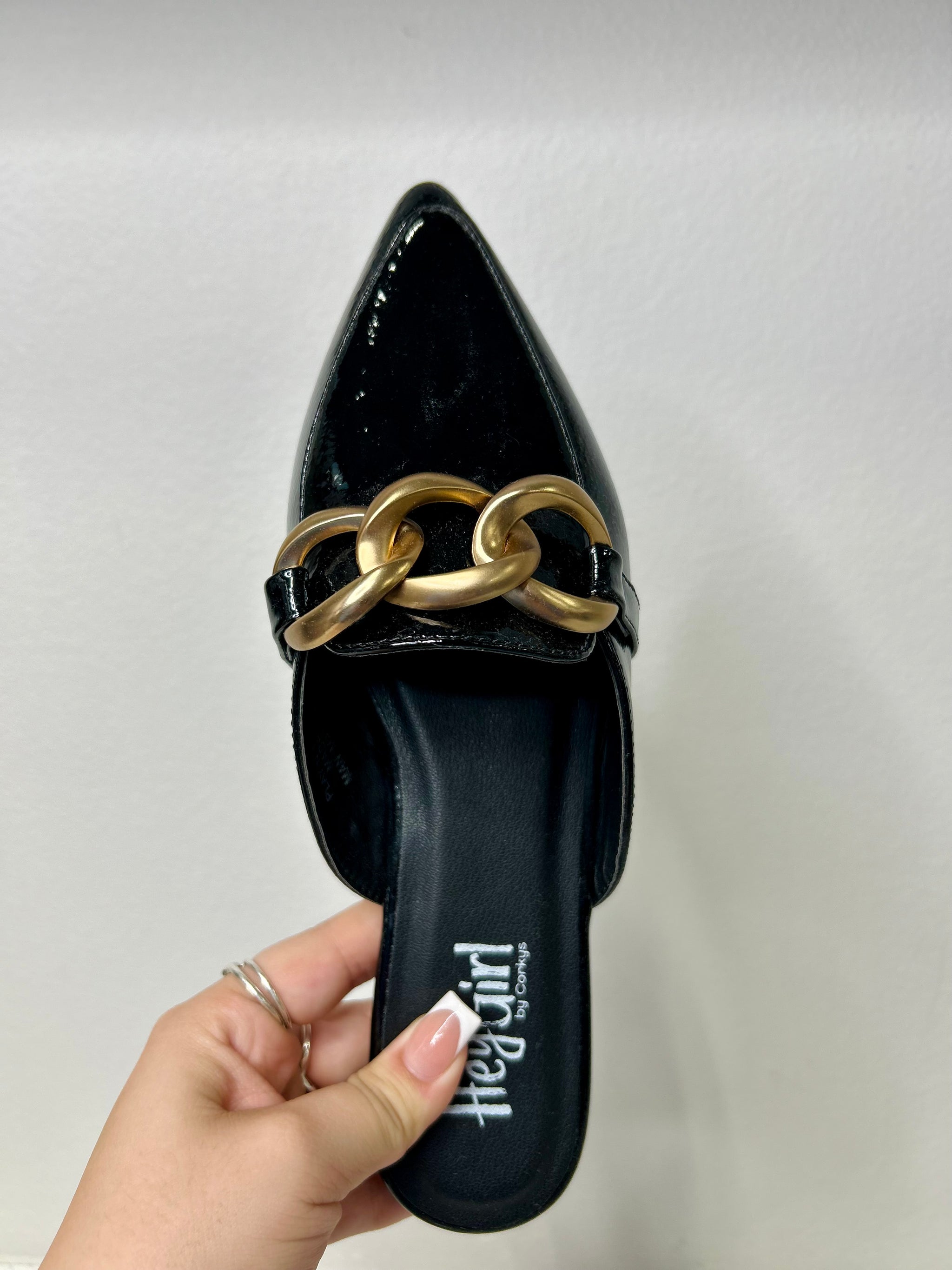 Make a bold statement with these glossy black chain mules. The sleek patent finish and oversized gold chain create an...