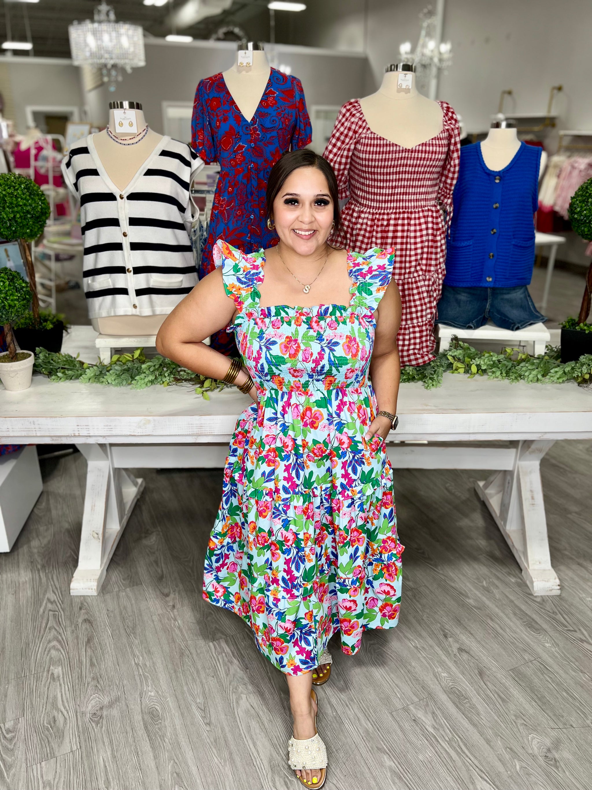 Elevate your wardrobe with our stunning BROOKE FLORAL DRESS in captivating midi length. The beautiful blue and green floral pattern...