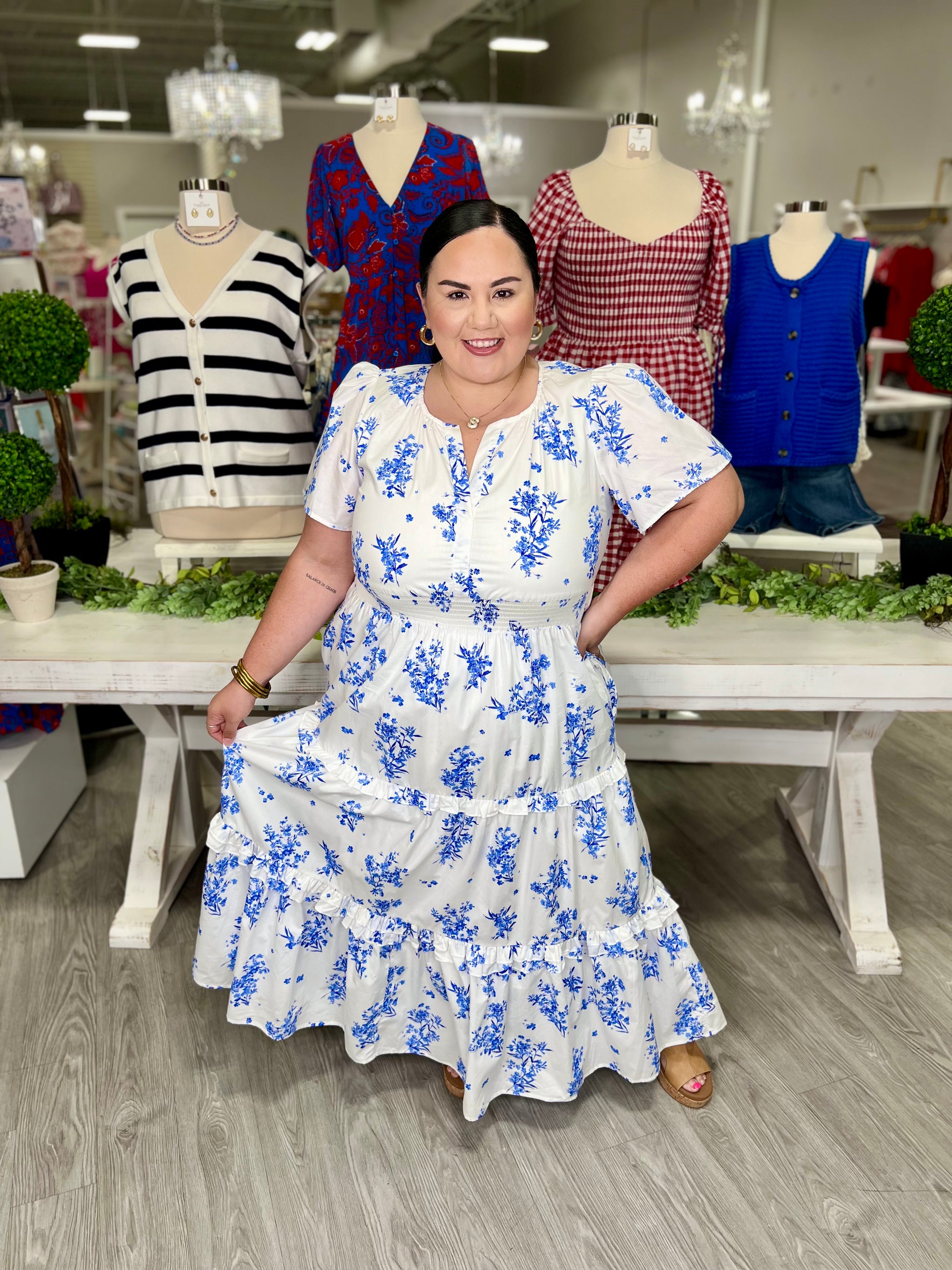 Elevate your wardrobe with the stunning TALIA DRESS, a cream and blue floral maxi that's designed to flatter your curves....
