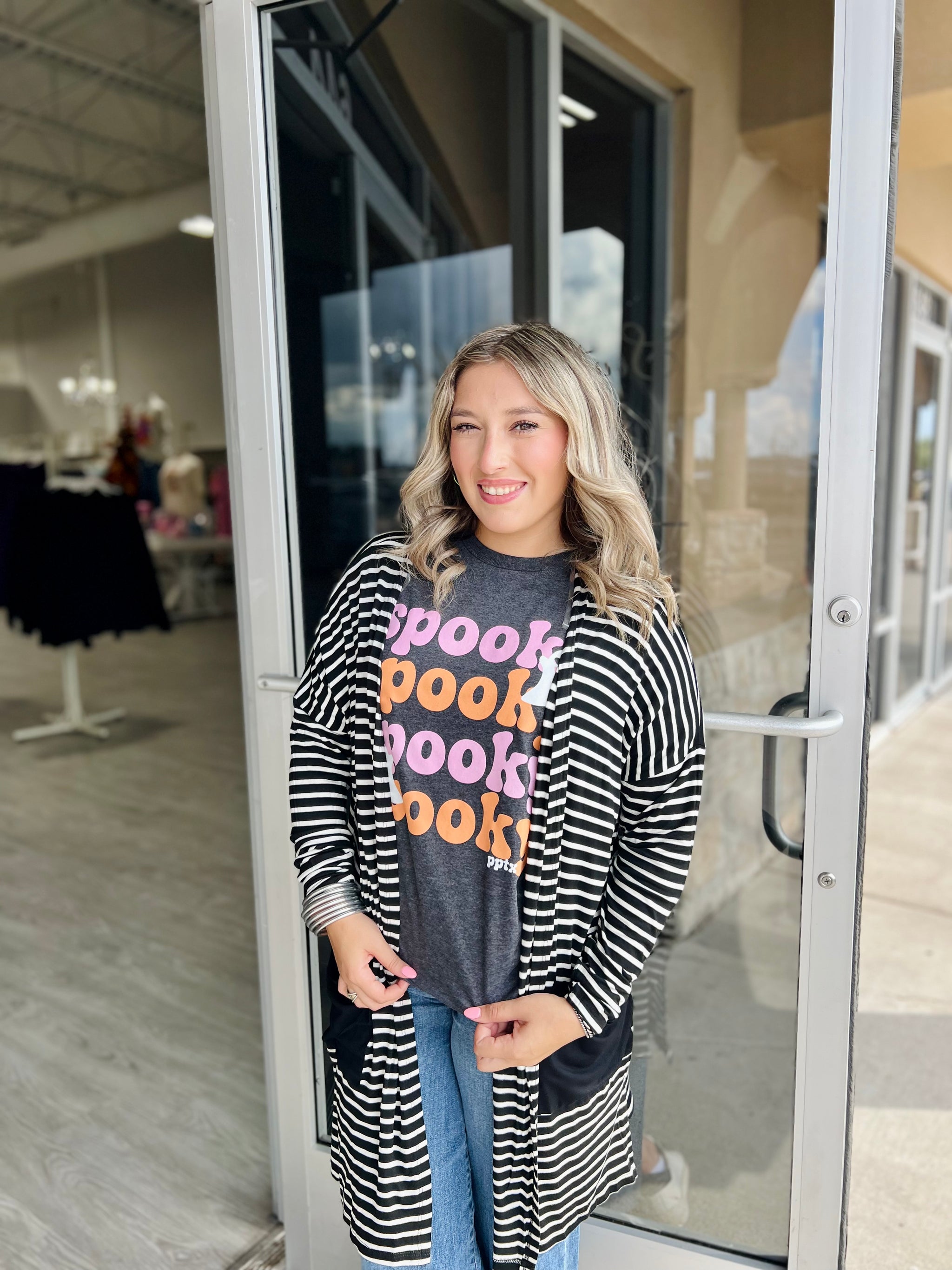Black & White Stripes are the new neutral...which means this thin small striped cardi will go with almost every tee....