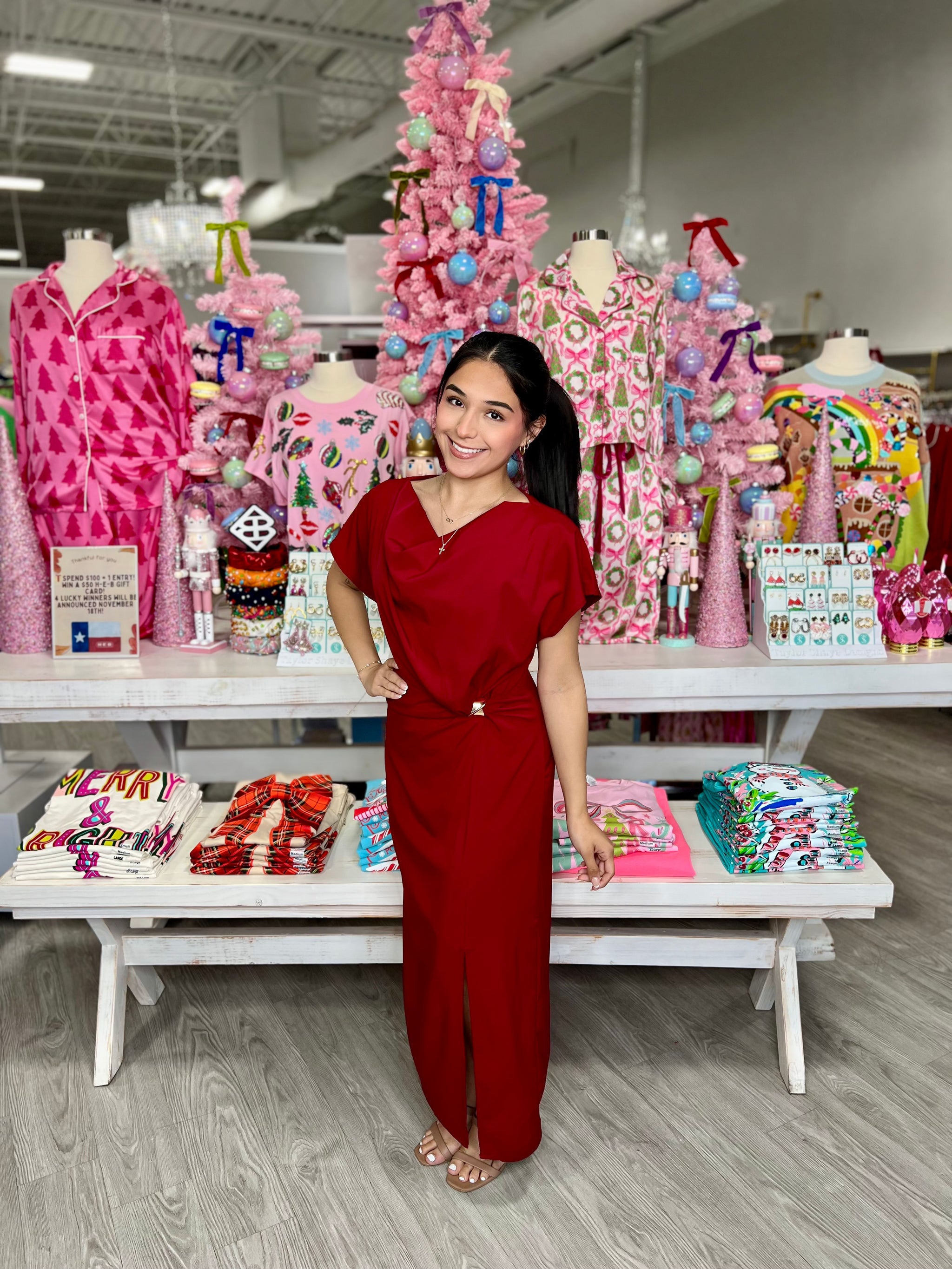 Elevate your holiday wardrobe with this stunning Catherine Red Dress—a sophisticated midi silhouette in rich scarlet that commands attention. The...