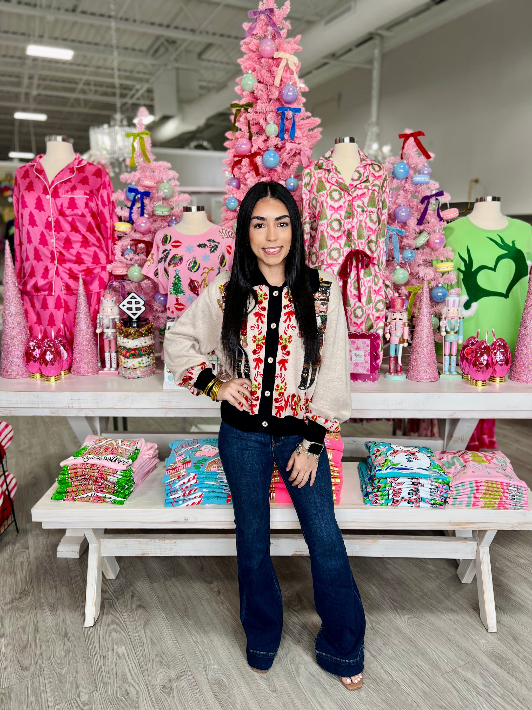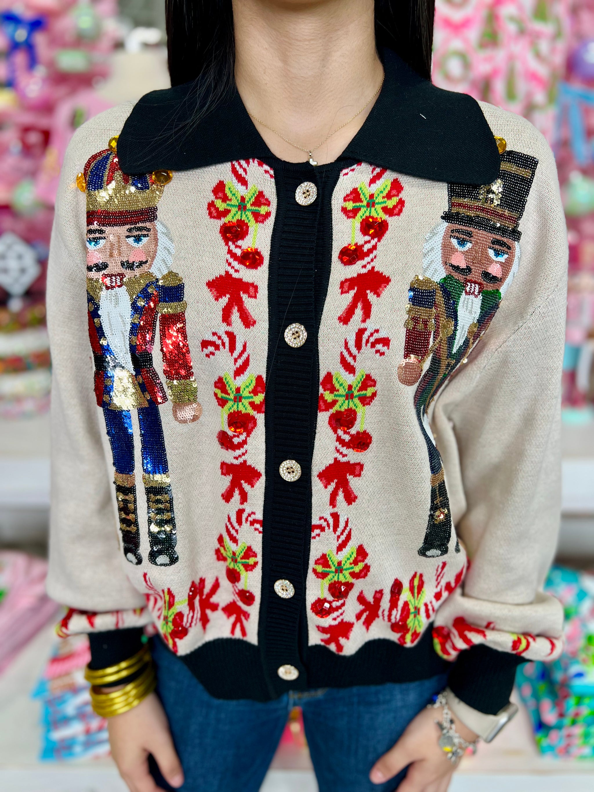 Celebrate the season in style with this Black Trim Collar Nutcracker & Candy Cane Button Up Cardigan from Queen of...