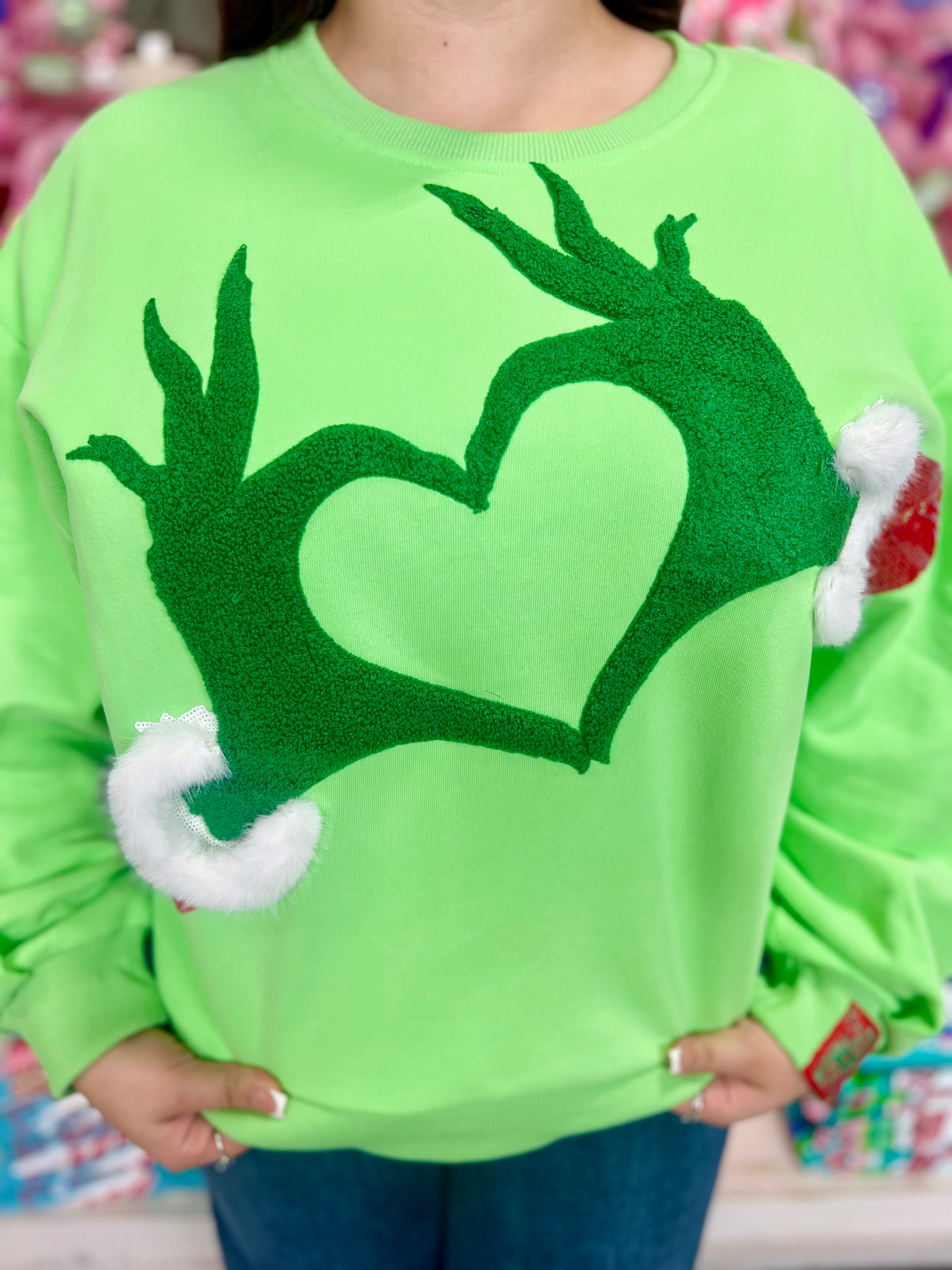 Celebrate the holiday season in cozy style with this light green sweatshirt featuring Grinch hands shaped into a heart. Perfect...
