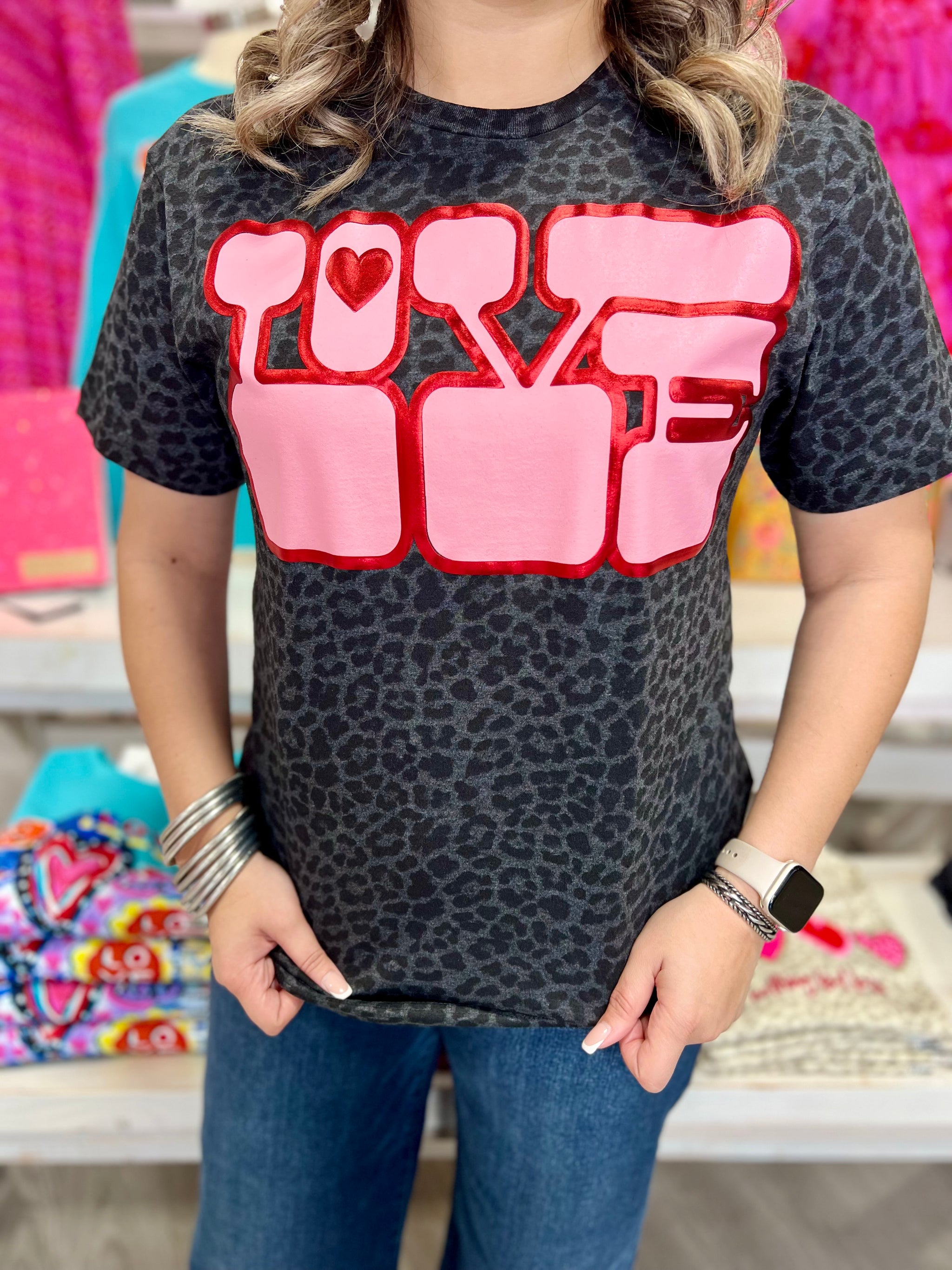 – Sold OutSpread the love with this adorable graphic tee featuring "Love" in a playful bubble font! The design pops with pink ink and a striking red metallic puff outline that adds dimension and charm. Choose between a trendy black leopard LAT short sleeve t-shirt or a cozy black Port & Company crew neck sweatshirt—both perfect for expressing your fun, affectionate style. Whether you're gifting it or treating yourself, this eye-catching piece brings joy and personality to any casual wardrobe.